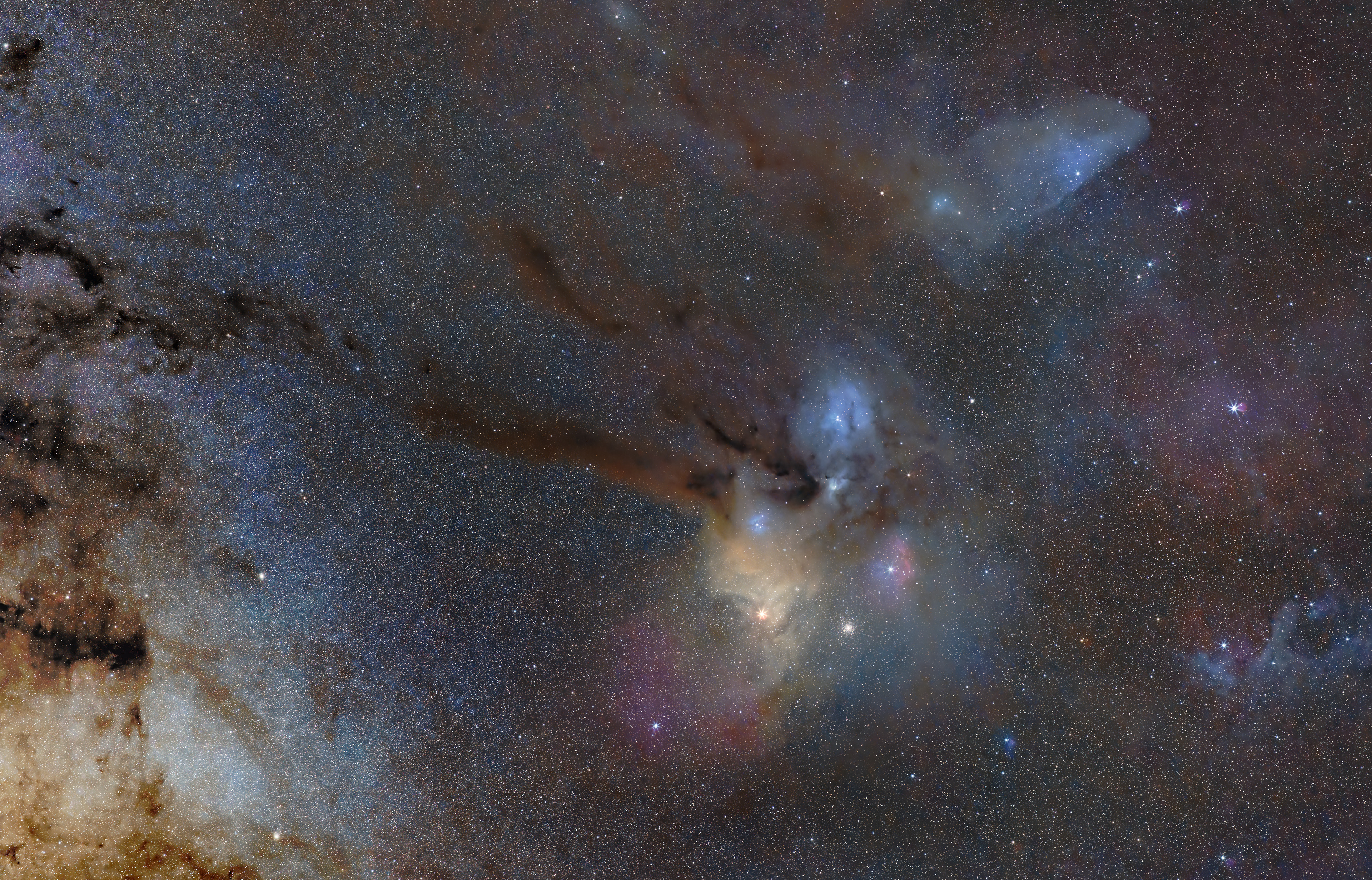 Reflection nebulae: The dark "hand" is visible in silhouette against a luminous background of reflection nebulae, which are clouds of dust that reflect the light of nearby stars.