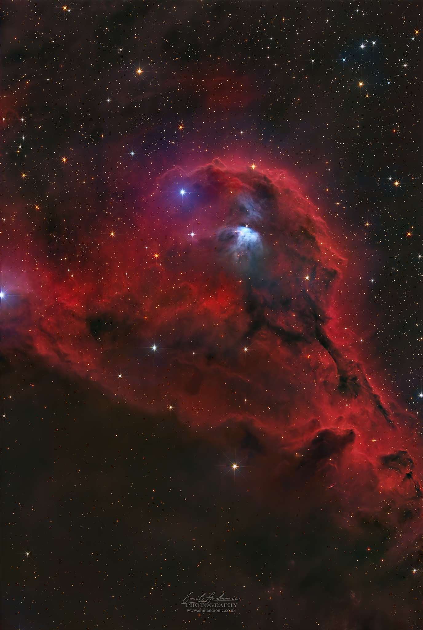 It is near the often-imaged reflection nebula, vdB 152, in the large molecular cloud, B175 (Bok globule) and can be seen at the upper left of Bernhard Hubl’s image of vdB 152 as a faint, red, crescent-shaped object.